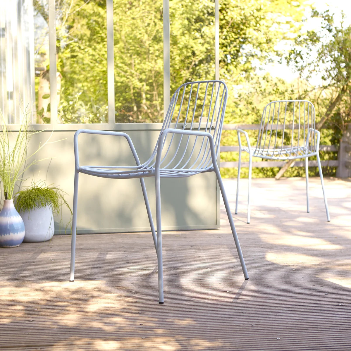 Relaxation and design! The Arty painted grey metal armchair can bring both of these to your garden. With their sleek lines and ergonomic contours they are both stylish and practical. Plus, when you combine these armchairs with a solid wood or metal dining table, they will transform yourn outdoor living space. Just as well suited to the indoors as the out, you could use them in a veranda or even in the dining room. We have them available in two different colour tones. So you could mix and match this blue grey version with a peacock blue version.