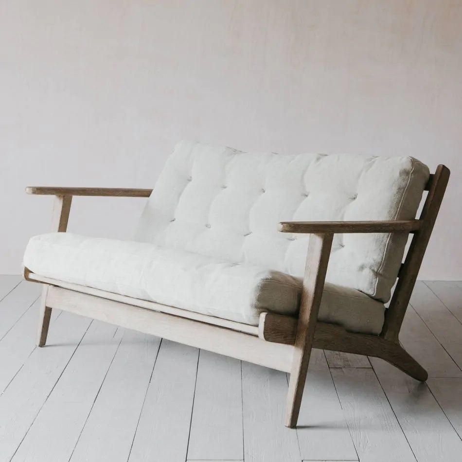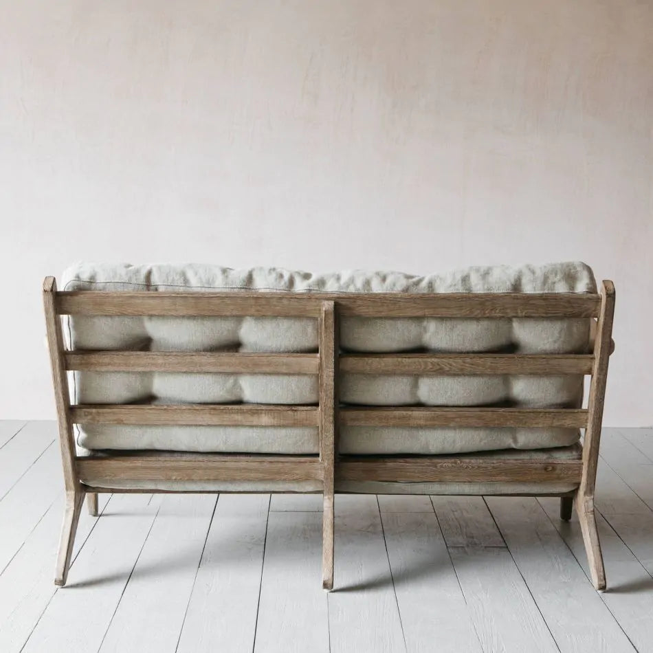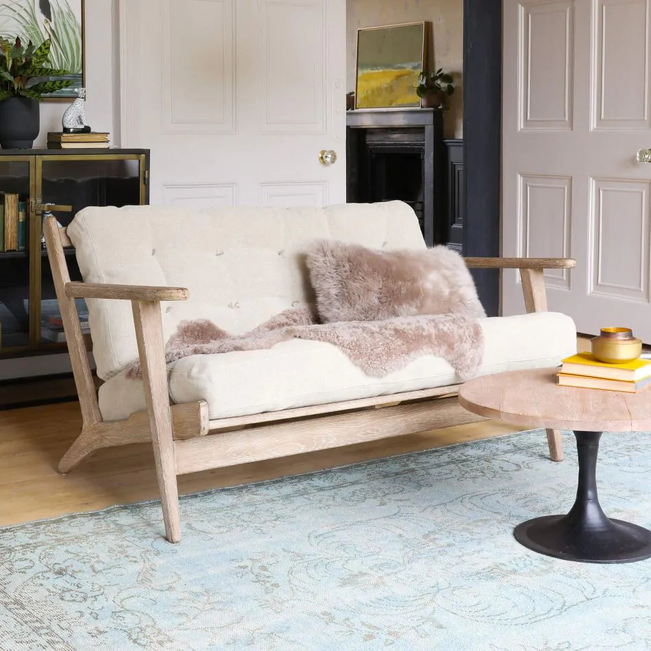 A mid-century style two seater sofa, featuring a Fraxinus ash frame and comfortable seat cushions with pinched detailing, sumptuously filled with feathers and fibre. Lyla Snuggles Sofa offers a reliable combination of style and comfort, perfect for any home. Its wood frame construction provides a sturdy base for years of enjoyment.