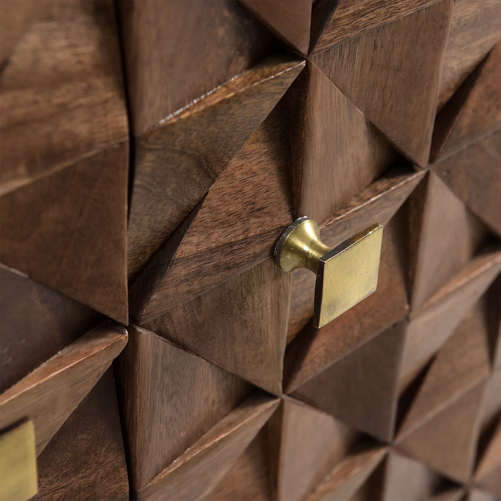 Introducing the timeless Della Hand Engraved Cabinet, a jewel from our captivating mid-century collection. Crafted with sturdy solid wood and adorned with sleek tapered legs, this classic cabinet boasts a sophisticated matte finish and striking golden fixtures. Open its two doors to reveal a spacious shelf that offers plenty of storage, and admire the exquisite hand-carvings that will leave your guests in awe. Don't miss out on this must-have addition to your home decor!