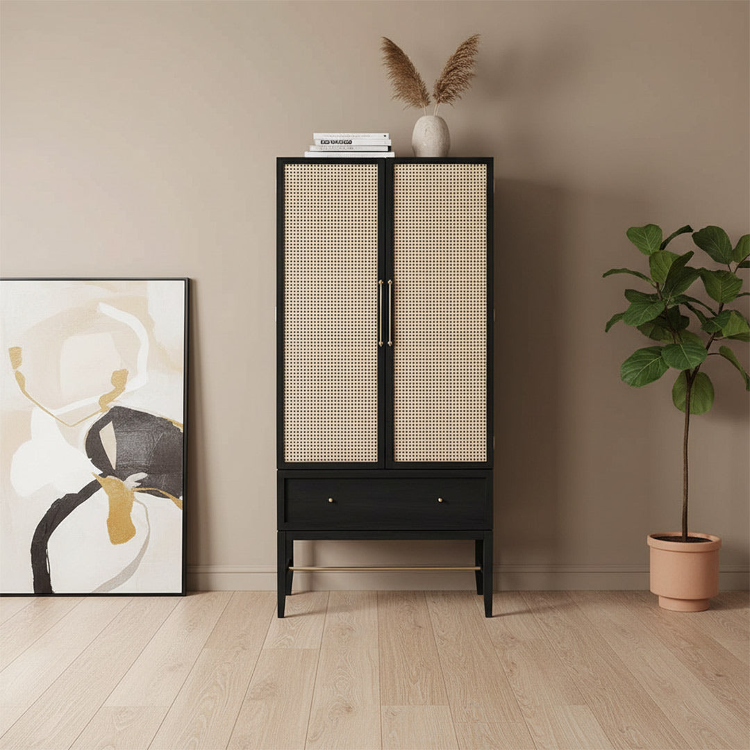 Woven Rattan Panels: The upper section features two doors with woven rattan panels, adding texture and a breathable, airy look to the design.
