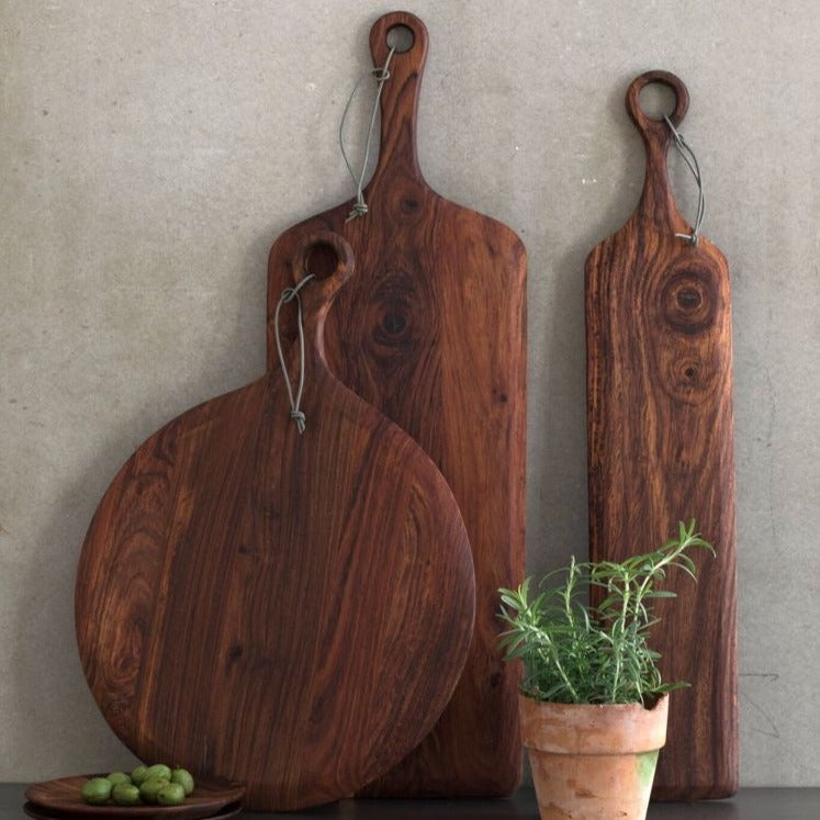 This products can be used as a platter, serving tray or chopping board. Handmade by skilled craftsmen with premium quality finishing, this serve ware is sturdy and spacious. Made of high quality solid wood, this board is durable. The string at the end of it makes it very easy to store. What makes it sustainable - Material, Durability and design (space efficient and multipurpose)