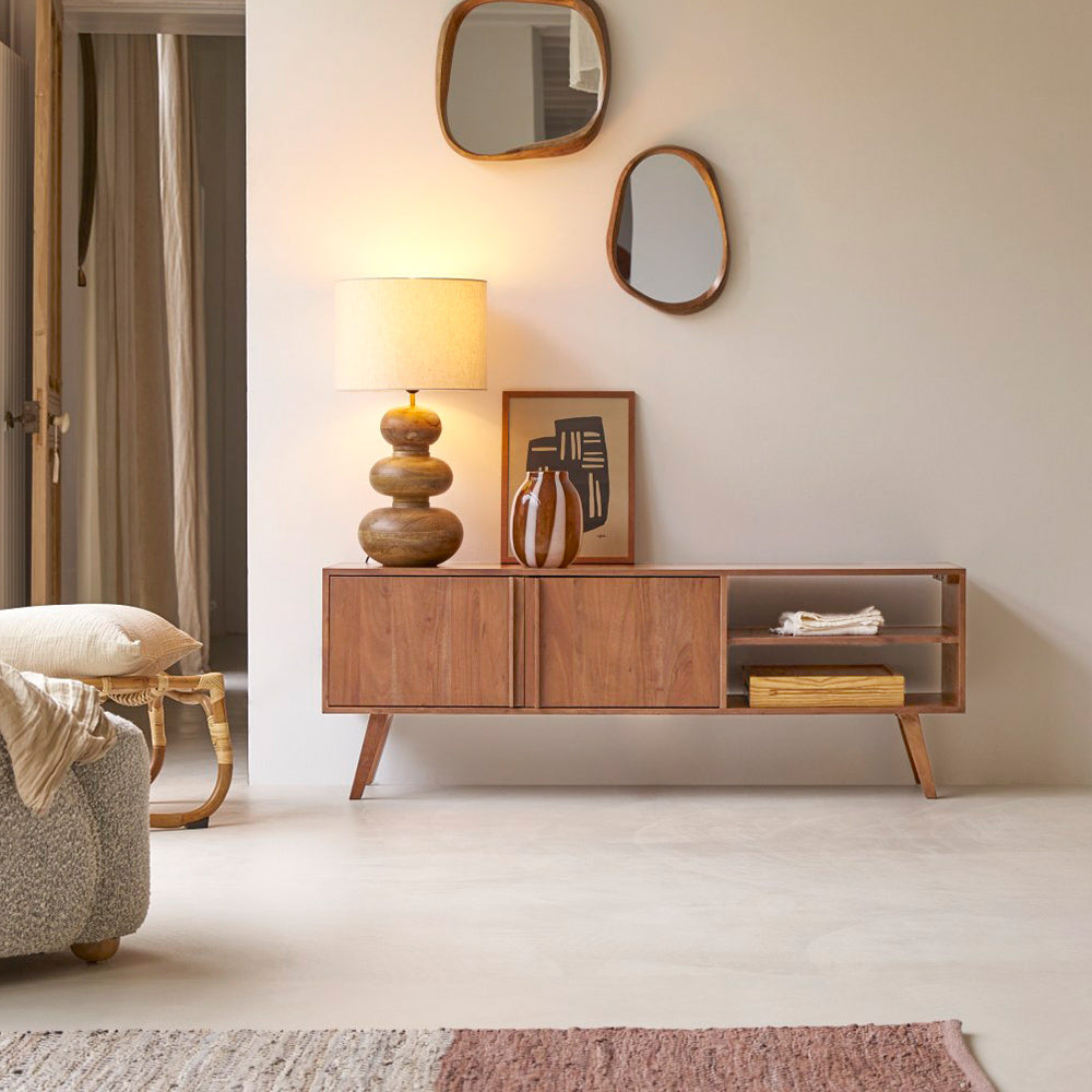 Transform your living or dining room into a Scandinavian oasis with our Neel collection. The Neel TV Unit Cabinet features 2 cupboards and 2 open shelves, supported by four inclined and removable legs. The spacious shelves provide ample storage space for all your accessories. Crafted from top-grade solid acacia wood, this unit is available in natural, honey walnut, and navy shades, making it a timeless addition to any space.