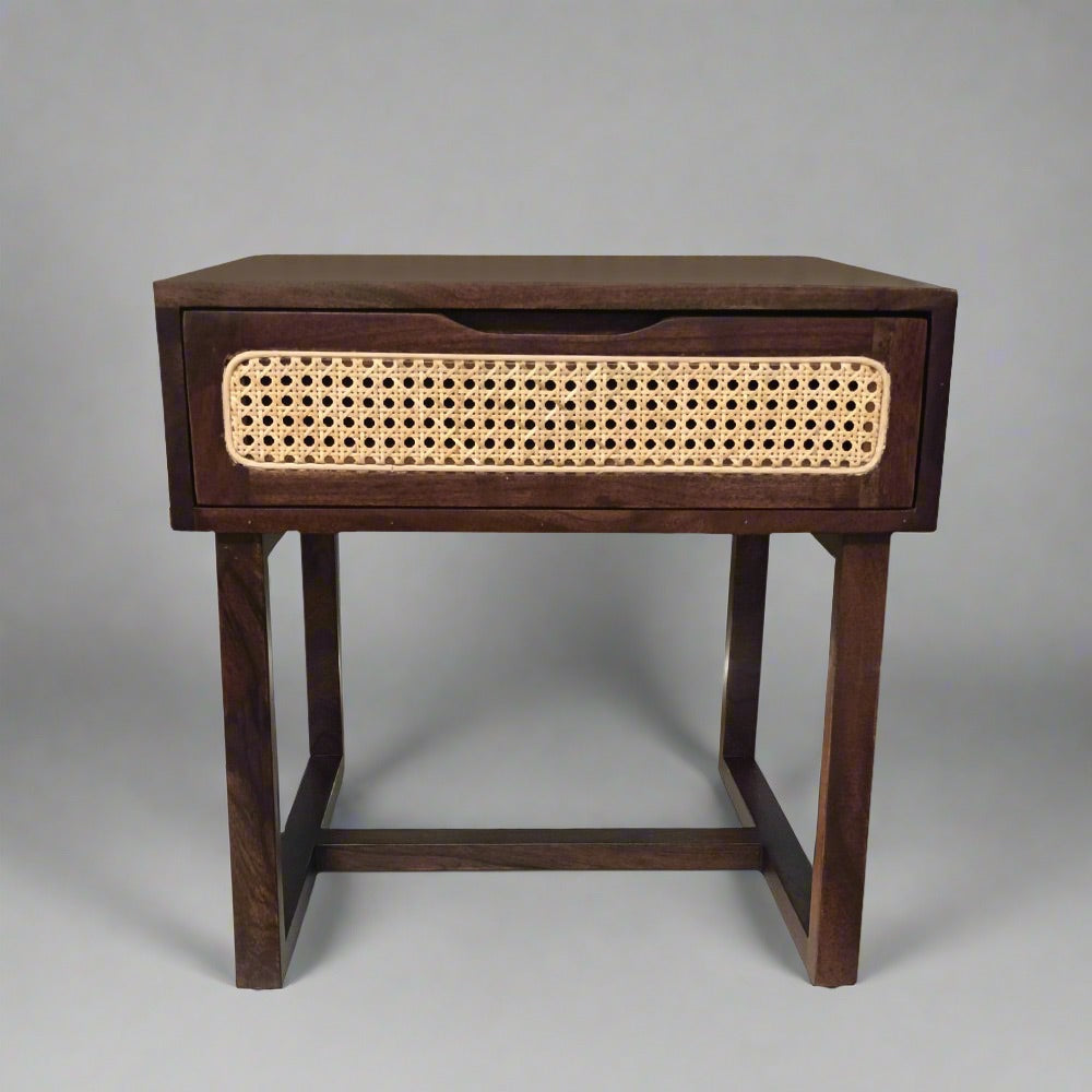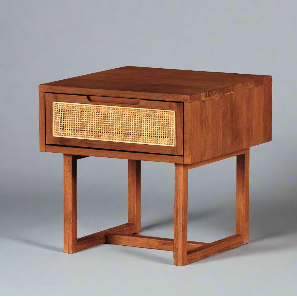 Olivia Bedside Table in Solid mango wood highlighted with wood grain in natural finishes with single drawer of solid wood frame caning and channel based mechanism with removable legs from classic to modern spirits.