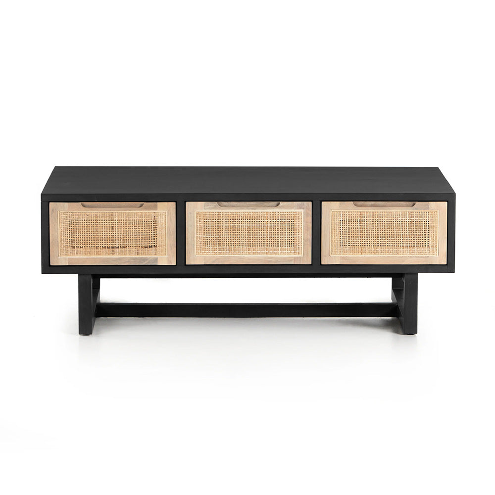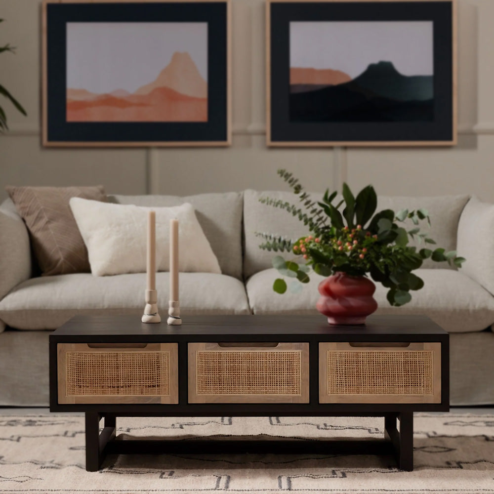 Mid century-spirited while beautifully on trend. Olivia coffee table from the House of Woodworm features three Cane-covered drawers and removable legs bringing storage, texture and functionality to the living room. Made from Solid wood and available in 4 contemporary finishes - Contrast Black, Natural, Honey and Contrast Walnut.